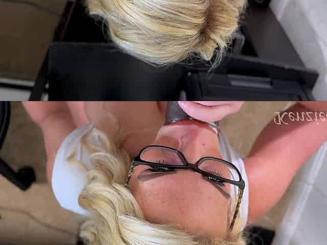 Amateur eighteen yr lovely gal with ash-blonde glasses and petite figure is giving a fellatio with messy jizz on bootie in white