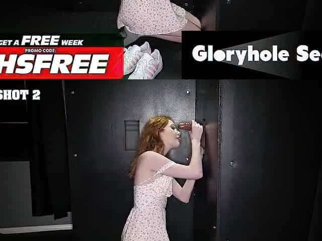 Redhead Sweetheart With Glasses Sucks Large Knobs At The Gloryhole