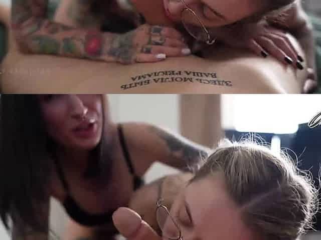 Inked chick deep-throats cock, glasses for palm job perky tits, pierced tongue, pov oral. Nose piercing, jism in pussy, caboose