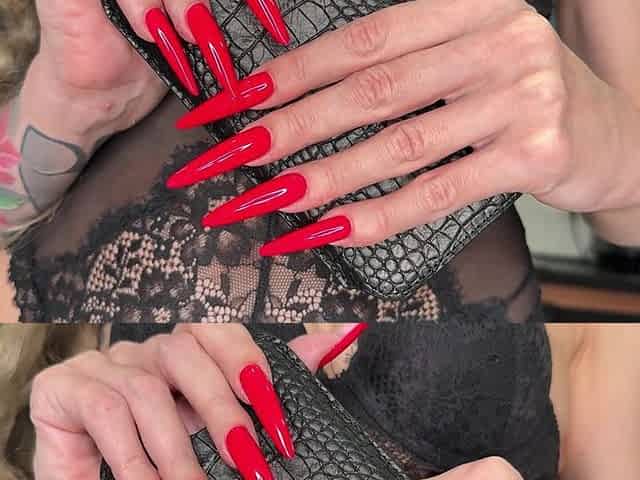 Bright Red Long Nails, Finger Sucking, Black Lace Lingerie