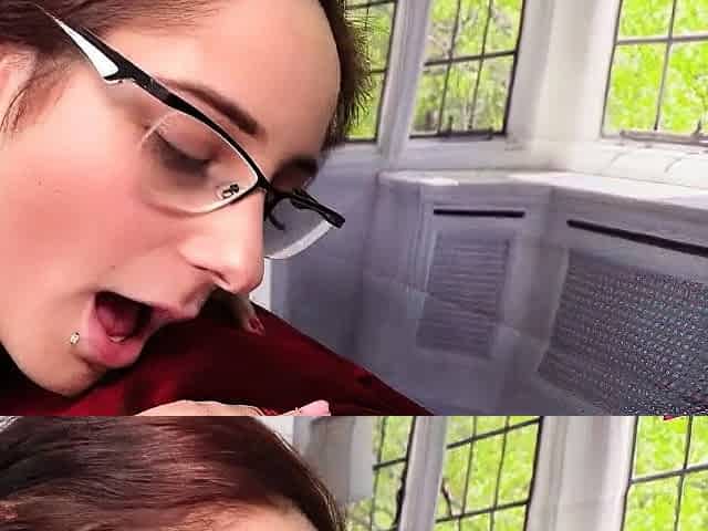cute woman wearing glasses gets her face inseminated