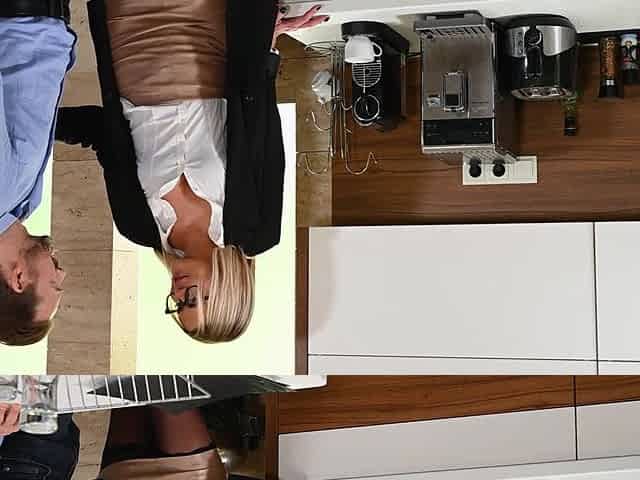 Cleaning lady with glasses sucks two guys at the bar before getting fucked