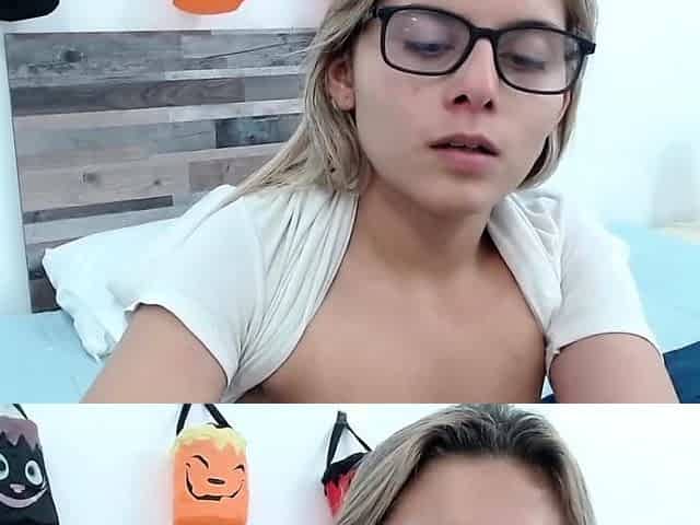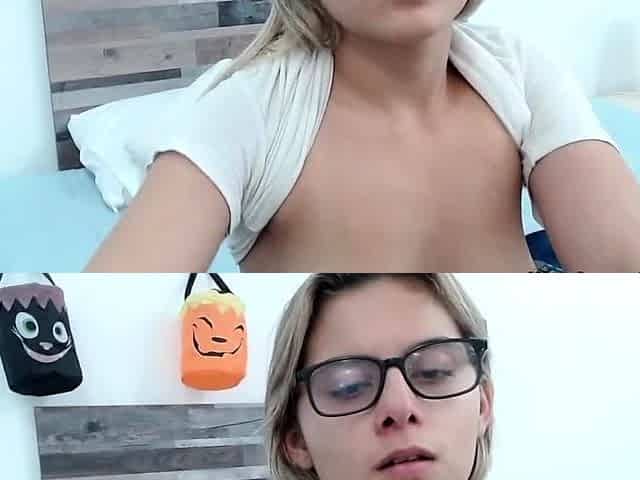 Small tits blonde in glasses toying herself on webcam