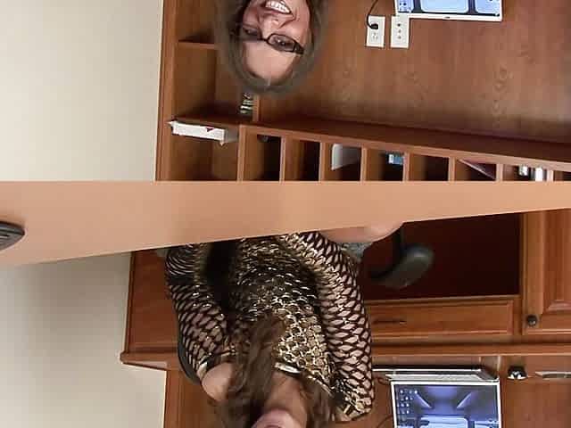 Tattooed secretary Kerry Louise with glasses riding her lucky boss