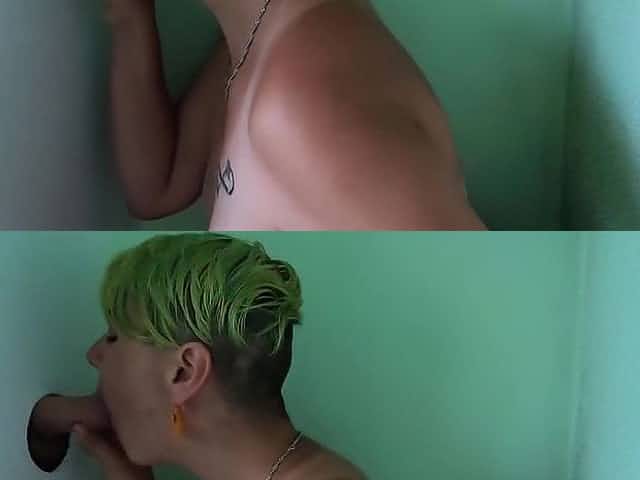 Blue- witnessed platinum-blonde is inhaling a rock stiff lollipop thru a gloryhole, to make it spew out
