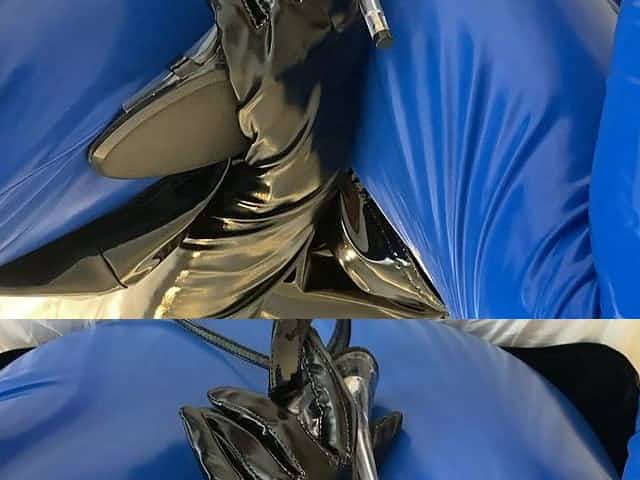 Blue Leggings, Black Vinyl Dress, Heels and Gloves