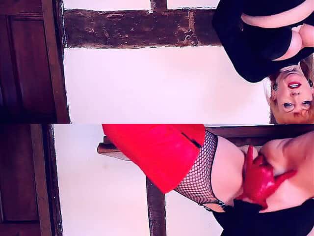 Sweet slut wears red fishnet hose and gloves in this threesome