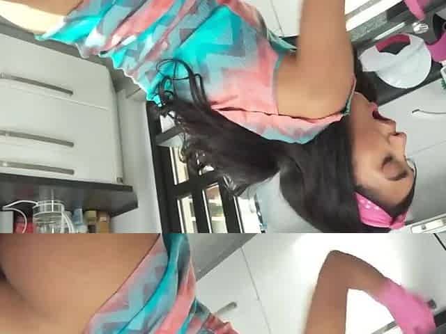 After washing dishes chubby whore fondles her pussy wearing rubber gloves