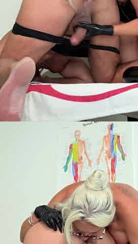 Sexy nurse in latex gloves masturbates and bangs a patient with a facial jizz flow