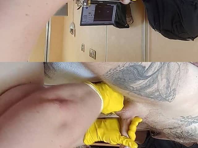 Double climax tugjob with red lengthy latex gloves and twat teasing