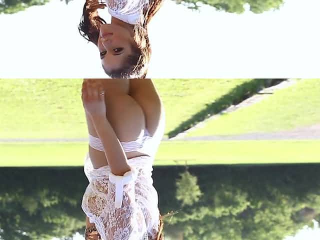 Pigtailed goddess in white lingerie poses her amazing body outdoors