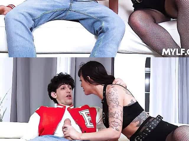 Inked goddess in fishnet Miss Raquel likes jumping on a big cock
