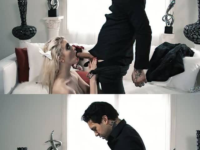 Marvelous blond sweetheart is eagerly sucking a goth hard knob, whilst kneeling in front of her partner