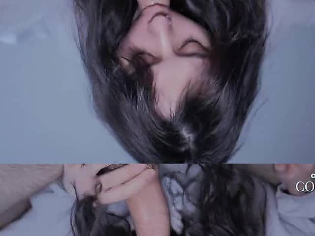 Hawt, teen brunette hair is gently sucking her lover's goth hard cock, in front of the camera