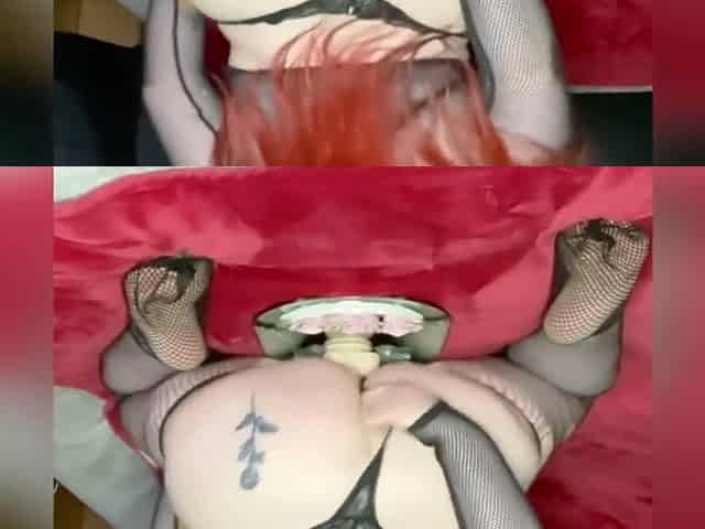 Red haired plumper with large bazookas is wearing erotic underware and riding a goth hard weenie