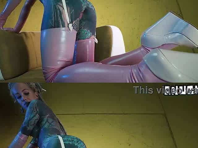 Hawt tattooed hottie in latex stretching herself wide with her toys