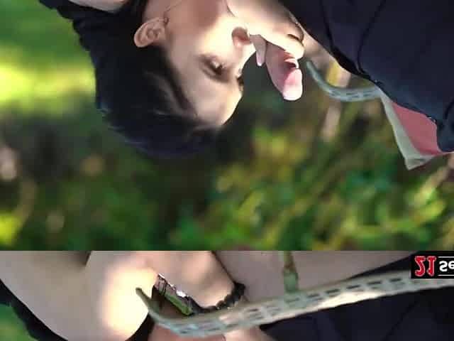 Cute Oriental brunette hair with petite boobs is sucking a goth hard weenie in a POV style