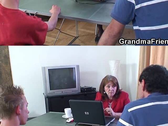GRANDMA ALLIES - Granny and boyz teen 3some in the office