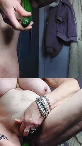 Grandma bangs bushy snatch with cucumber