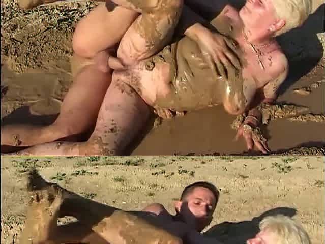 Two fat blonde grannies fucked in the mud by young guys outdoors