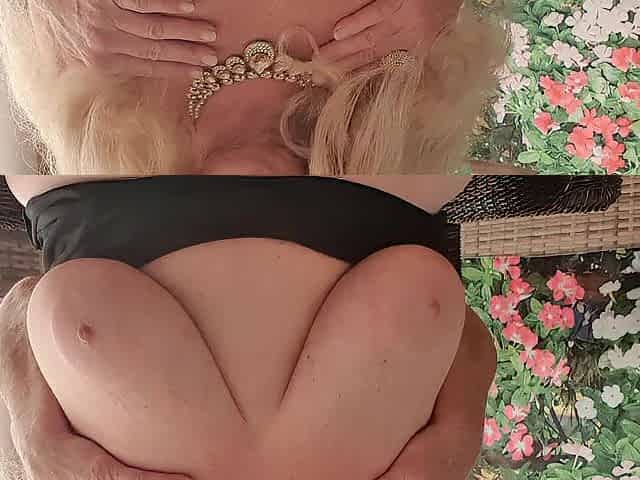 Blonde granny Pantera oiled up her huge boobs and rides toy