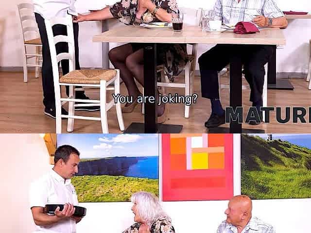 MATURE4K. Old man encourages the waiter by allowing him to sneak in with his wife
