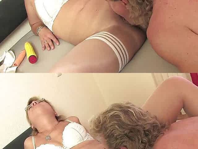 Granny moans in pleasure as a monster dildo is shoved into her pussy