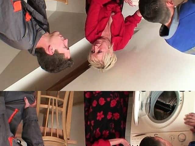 Very old blonde granny pleases two workers