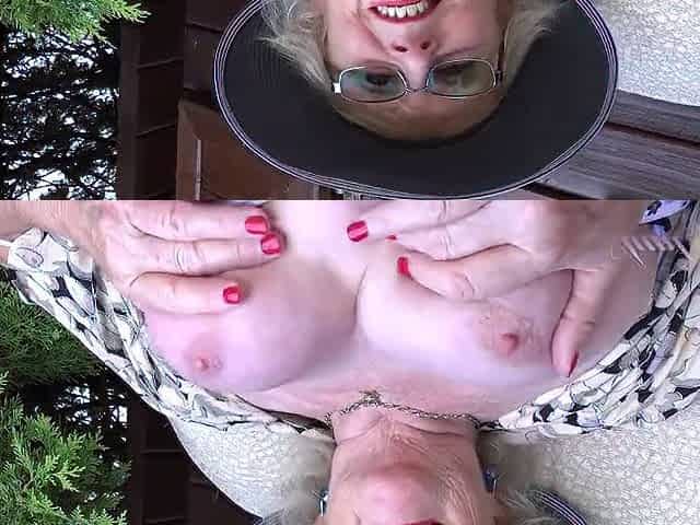 AuntJudys - 66 year old hairy mature GILF Ms. Claire sucks your cock in the garden POV