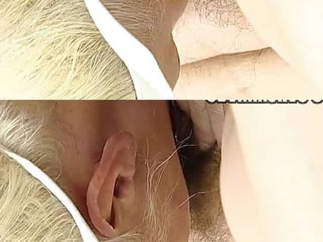 Two blondes licking each other.