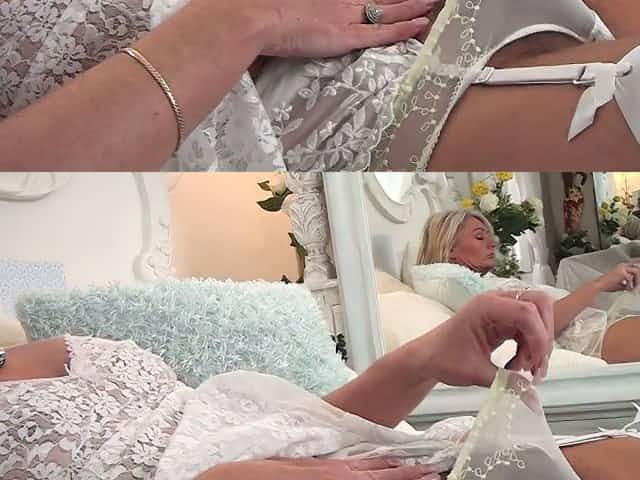 Old bitch in lace white lingerie and stockings Ellen B finger fucks hairy twat