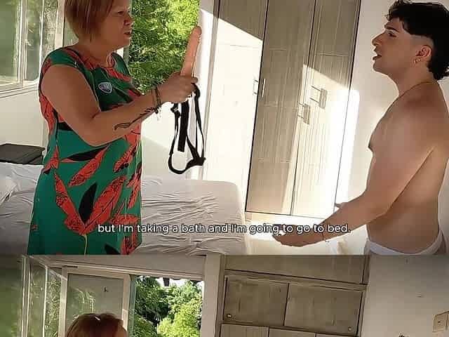 Step grandma finds a belt on and suspects her stepson is homo, confronts him and screws hard his butt!