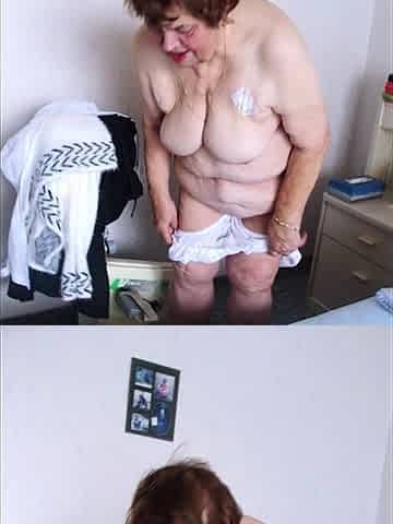 Smutty and dirty: granny put her urine to her massive bazookas and body