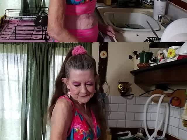 UGLY GRANNY POSES FOR CAM AND POKES ASS