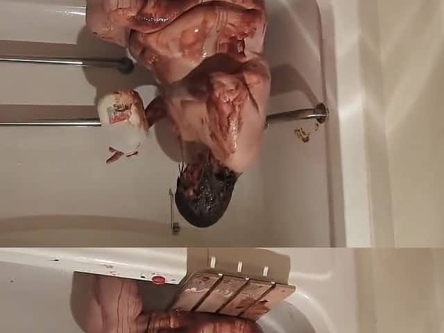 ugly, obese old lady, huge belly, nude shower with chocolate syrup