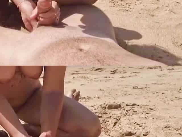 Busty amateur Inna Innaki gives handjob and deep throats a lollipop at a nude beach in Greece