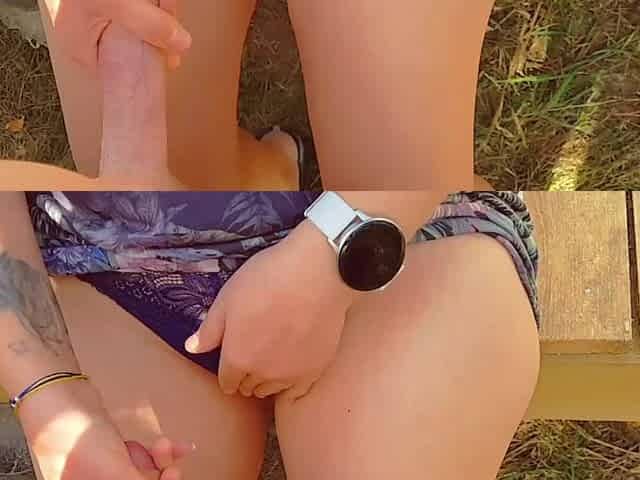 Cumshot on panties after a handjob and pussyjob outside