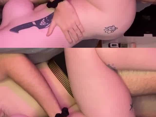 Pink hair, leather leggings, assjob cum in pants, lapdance grinding ended with cum in his pants