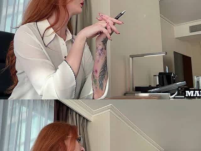 A trapped redhead boss gets her booty screwed in the office by 2 French ebony boyz!!!
