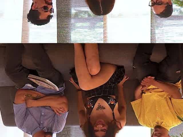 Breathtaking brunette hair enjoying in trio screw indoor and outdoor