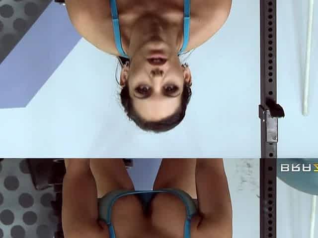 Stepmom shows off her big boobs in a bathing suit during a hardcore workout