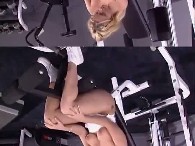 Blonde lesbian babe fingering her big tits gym instructor