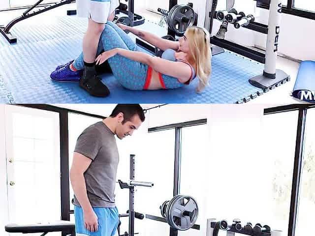 Rough fucking in the gym with blonde Adrienne and her trainer