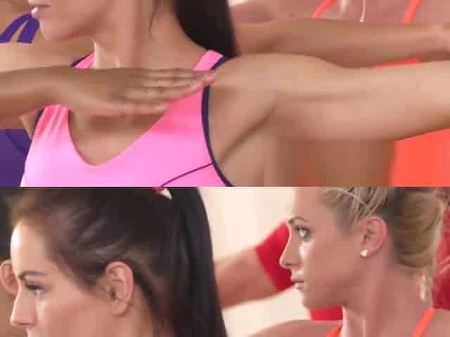 Two Fit Brunette Babes Fucking Coach In The Gym