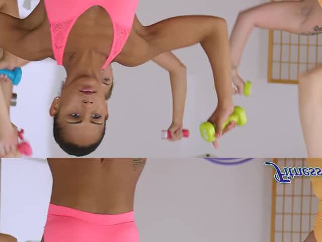 Two babes work out then have a threesome with their trainer