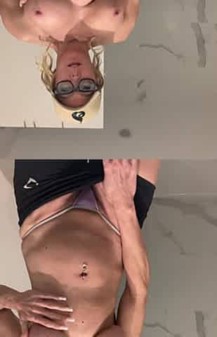 Nice-looking Slender fitness can't stand the urge and touches her twat in the gym washroom