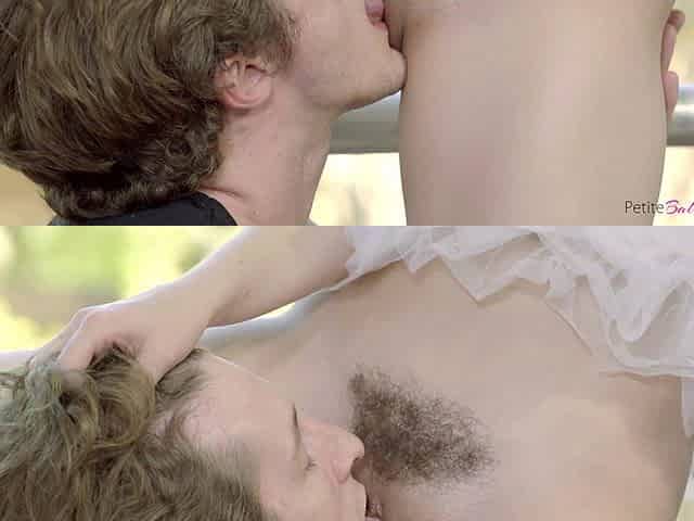 Trimmed pussy ballerina Ember Stone drops on her knees for a dick