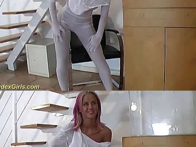 Spandex girl squeezes herself in a glass box