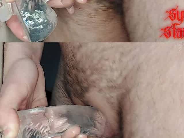 FTM transboy frots with clear sex-toy and gapes his juicy cunt open ASMR