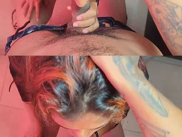 Hot redheaded in latex gets cum on her face